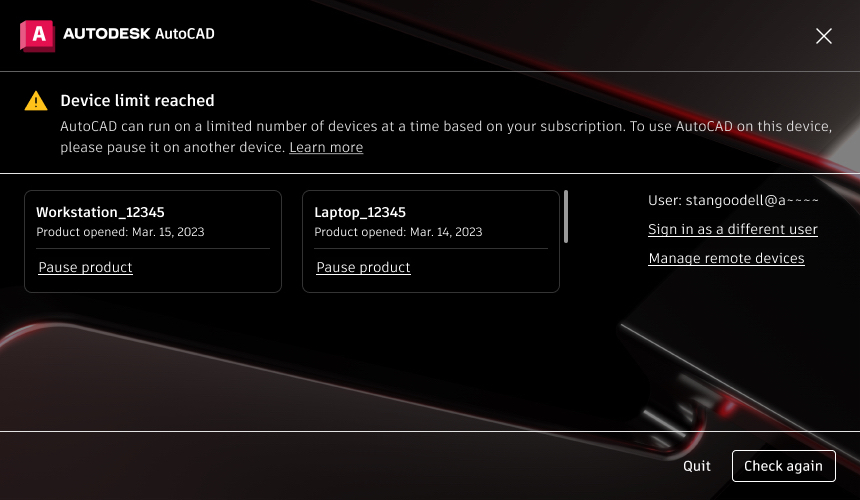 Autodesk Á¦Ç°ÀÌ µ¿½Ã¿¡ ½ÇÇà ÁßÀÎ °æ¿ì ÀåÄ¡ Á¦ÇÑ¿¡ µµ´ÞÇÏ¿© Subscription ¼ºñ½º ¾à°ü¿¡¼ Çã¿ëÇÏ´Â ÃÖ´ë ÀåÄ¡ ¼ö¸¦ È®ÀÎÇÕ´Ï´Ù.